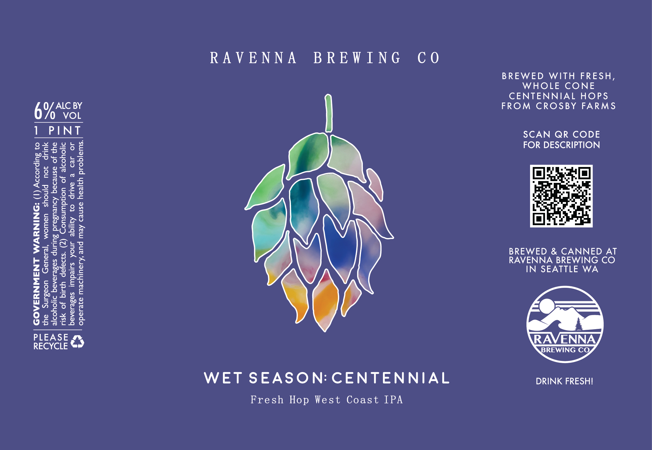 This West Coast IPA was steeped on hundreds of pounds of fresh, wet, whole-cone Centennial hops from Crosby Farms in Oregon. It was then dry hopped with Cascade, Mosaic, and more Centennial. Look for big notes of lemon peel, resinous pine, botanicals, and a hint of grapefruit. Light bodied and dry, with a soft lingering bitterness.